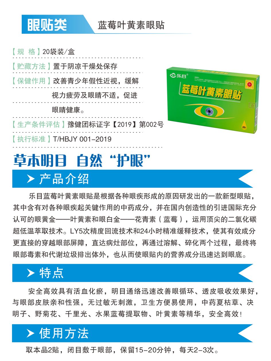 乐目蓝莓叶黄素眼贴是由郑州乐目商贸有限公司、北京爱儿视医学技术研究中心、北京耀明医学技术研究中心、北京视康明医药研究院,根据各种眼疾形成的原因共同研发出的一款新型眼贴